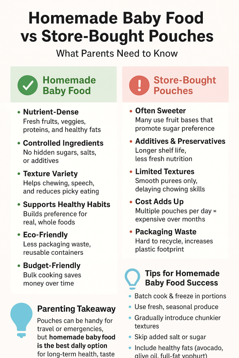 Pouches can be handy for travel or emergencies, but homemade baby food is the best daily option for long-term health, taste development and lowering risks of childhood obesity