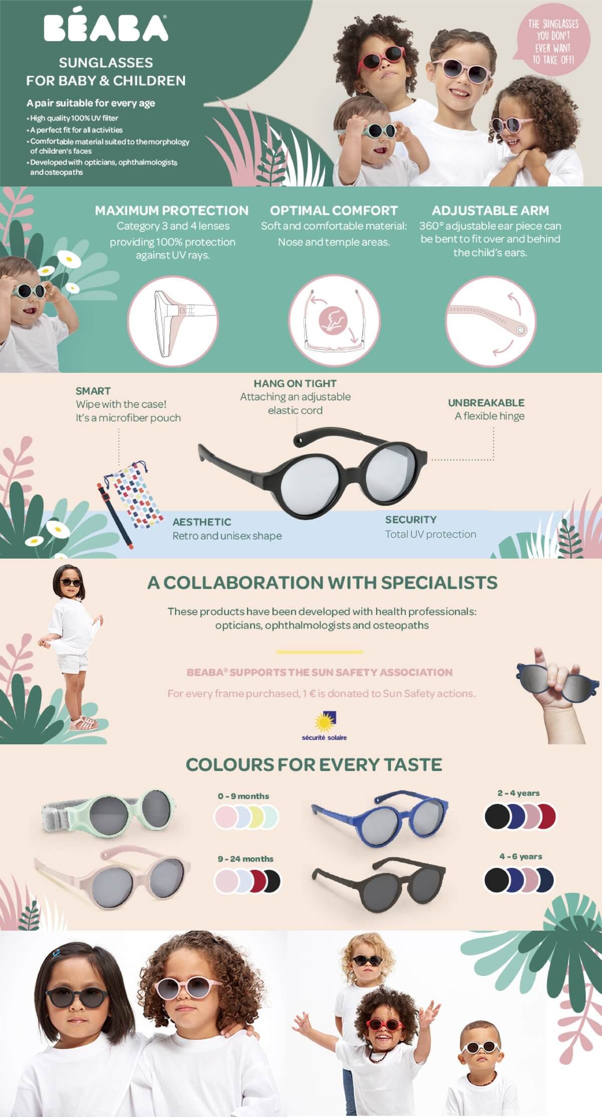 Béaba sunglasses are the result of a collaboration with specialists, including opticians, ophthalmologists, and osteopaths, to provide optimal protection and comfort for children. Designed to ensure maximum protection against sunlight, these sunglasses feature side shields that block harmful rays coming from the sides.