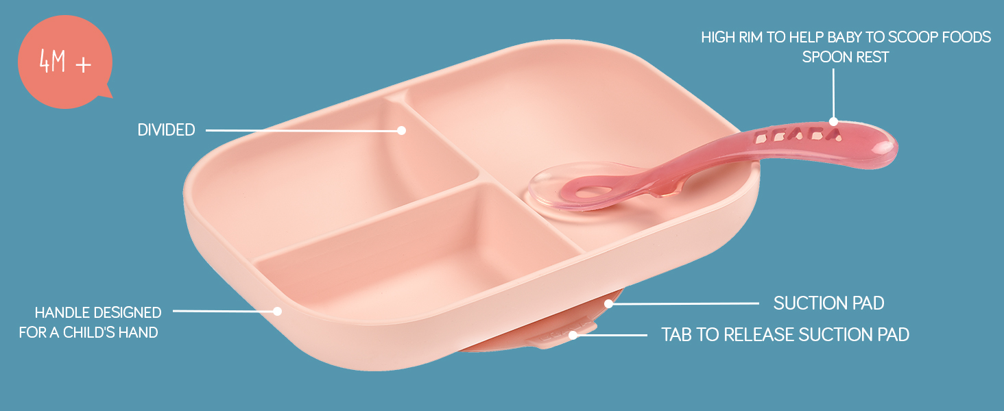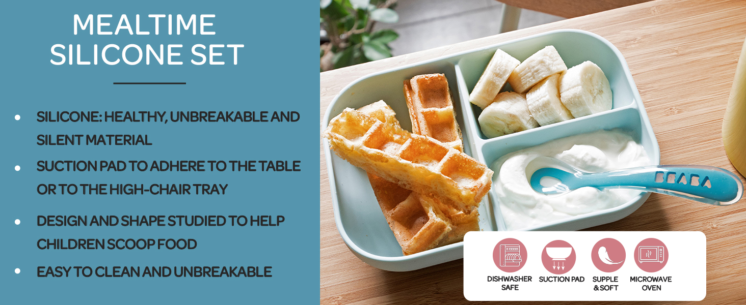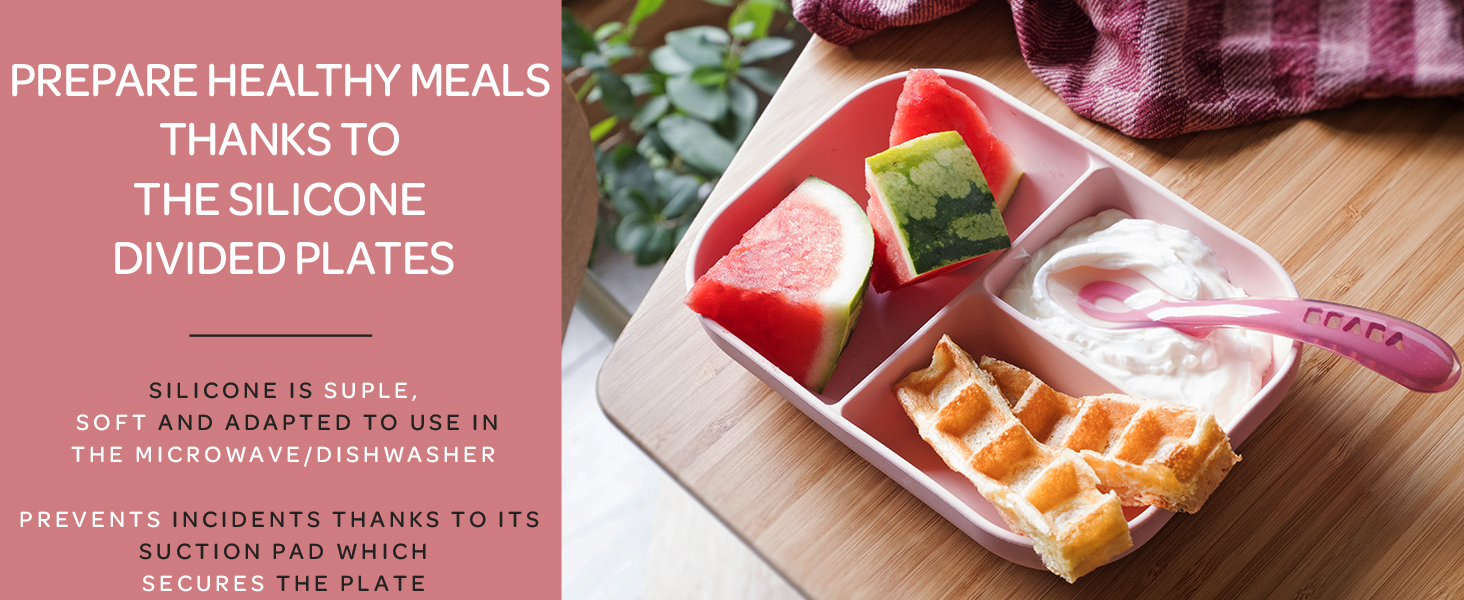 Mealtime without the mess – our divided suction plate meal set is a mealtime essential for every family! Our 100% silicone plate is perfectly size for toddler portions and has a suction base that will ensure the plate and food stays in place during mealtime. Vertical sides allows for easier scooping, helping any little one get food on their spoon!