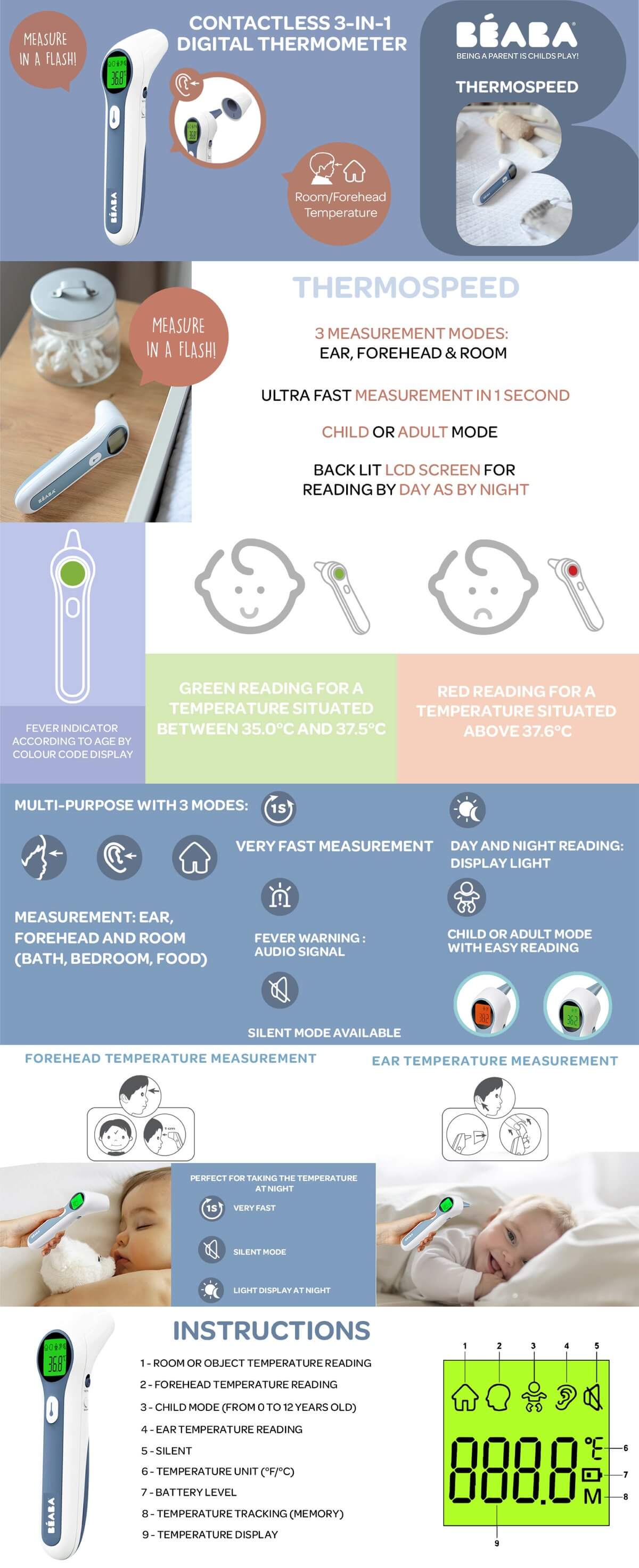 The Infra-red Thermometer by Beaba is the multi-purpose thermometer with fever indicator, accompanying the child, from birth to adulthood.