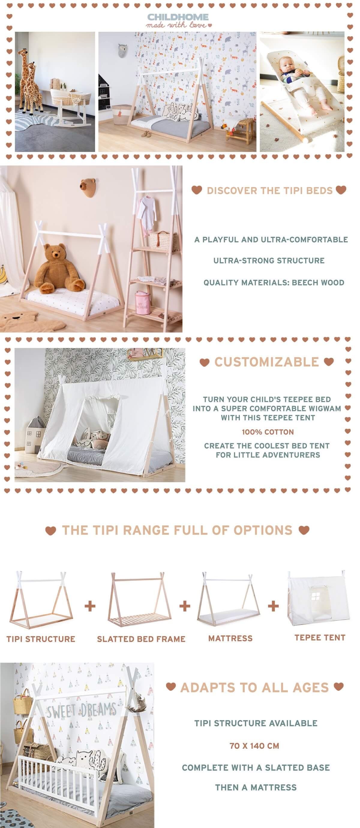 Transform your Childhome tipi bed into a super cosy wigwam with the tipi bed cover. Bedtime has never been so much fun! Your little one will experience all kinds of adventures in the hip teepee tent, while playing or in his dreams. With a cool adventurous tent, the children's room is undoubtedly the eye-catcher of the entire house! This tipi cover is suitable for the tipi bed frame 70 x 140.