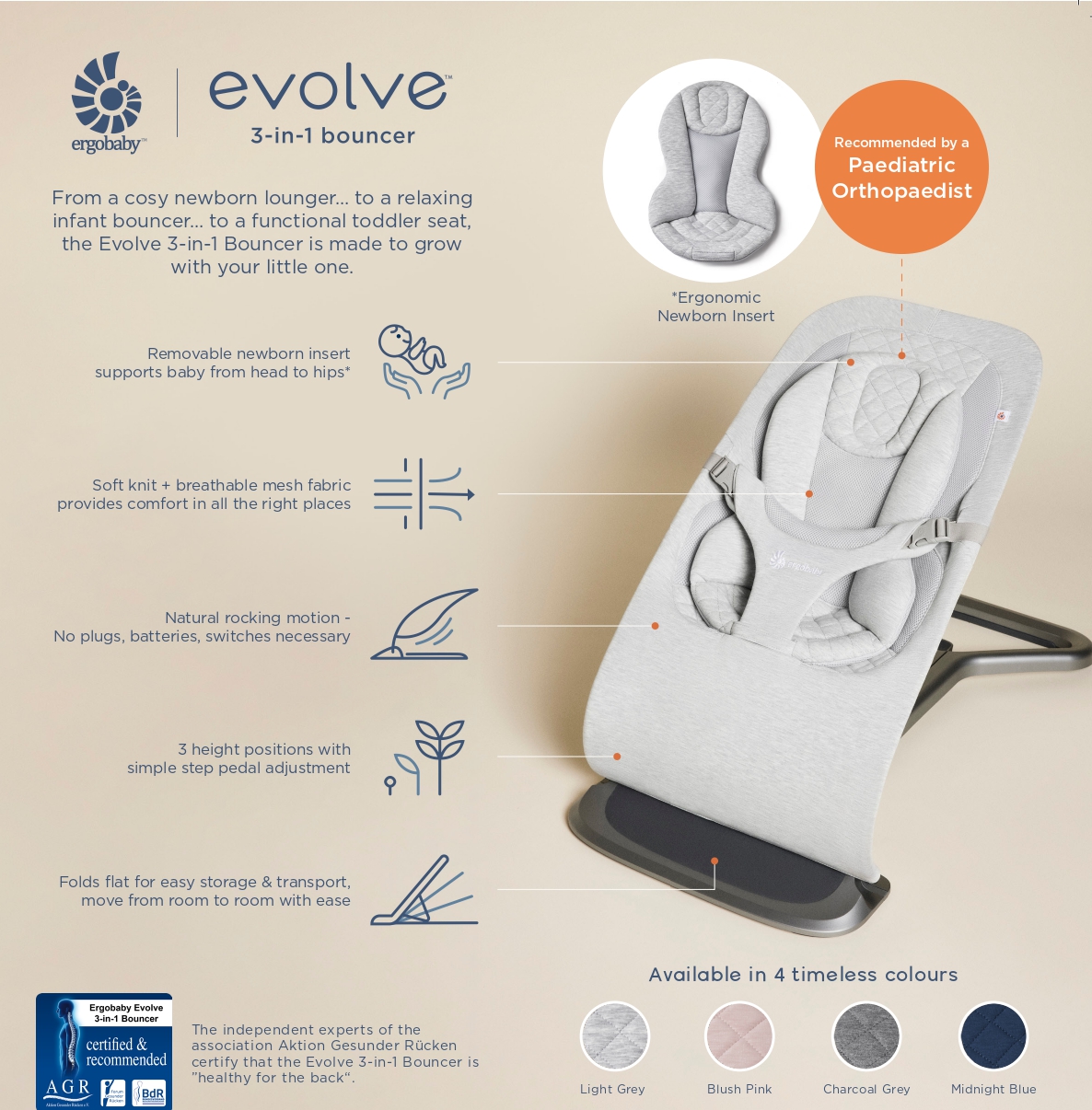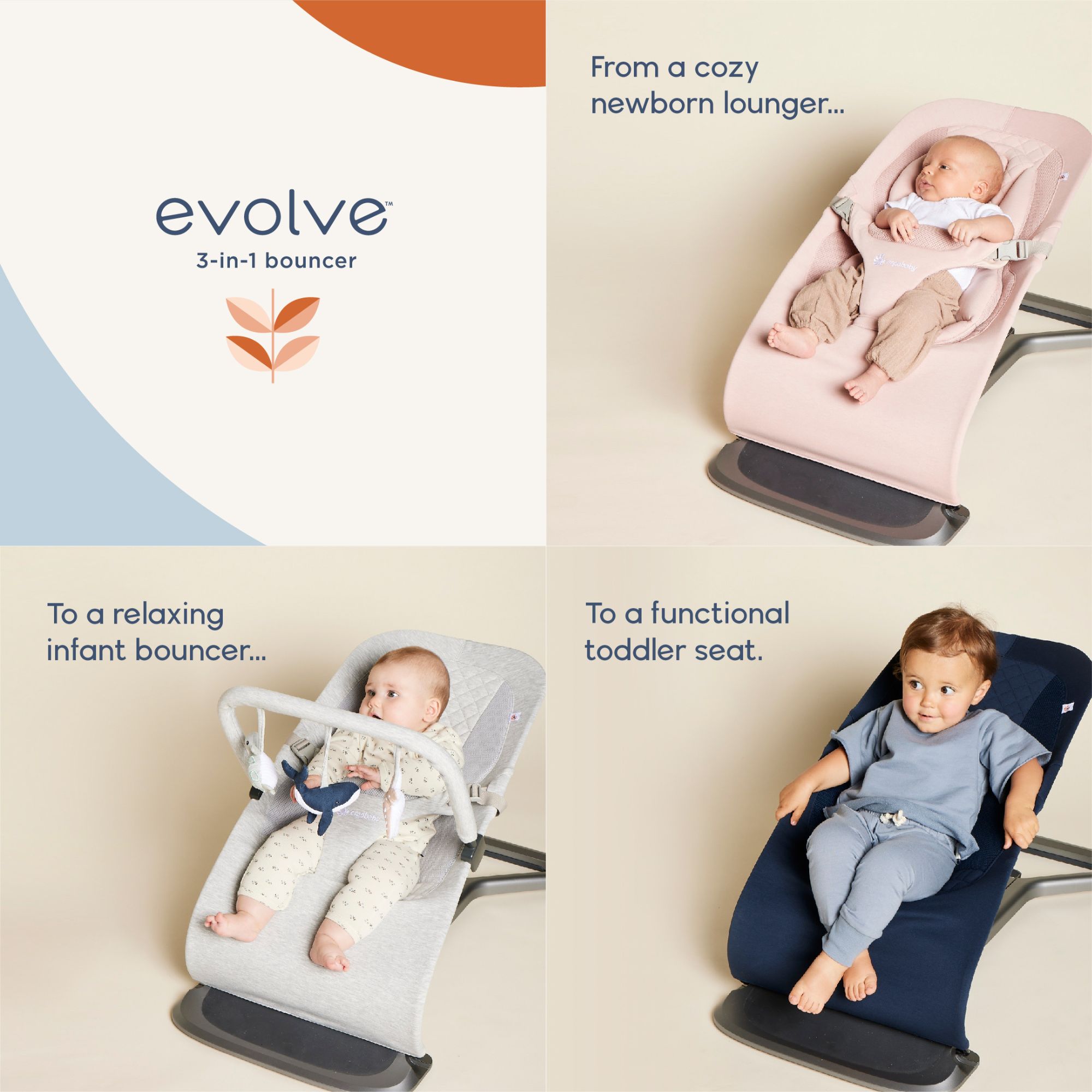 Evolve Bouncer is there for the moments you need for you. When you can’t have your little one safe in your arms – this baby bouncer is another safe place for them. From a cozy newborn lounger – to a relaxing infant bouncer – to a functional toddler seat – the 3-in-1 bouncer is built to grow with your family. With 3 distinct heights, and a timeless, lightweight design, Evolve simplifies your life, so you can focus on what matters most.