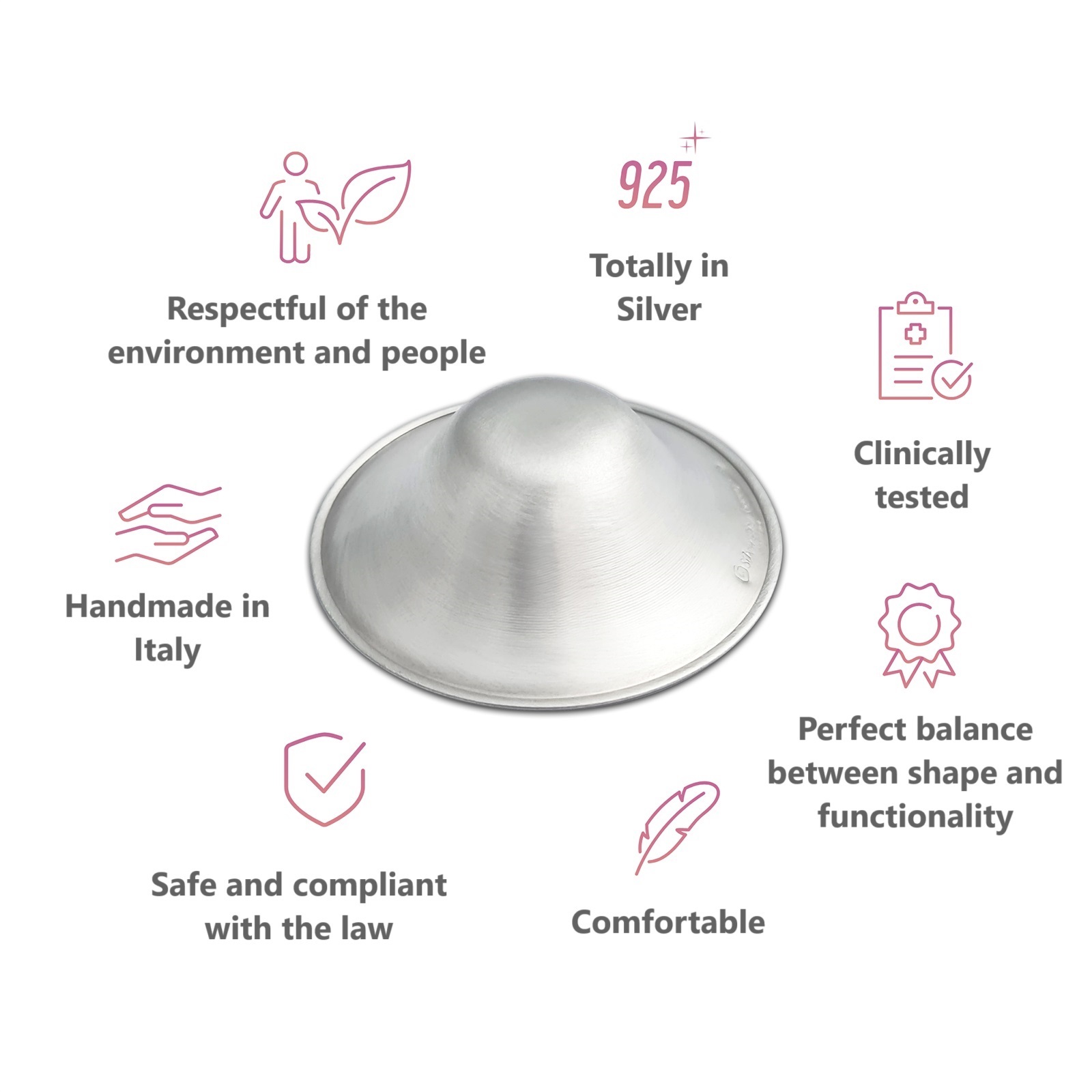 Harnessing the benefits of 925 silver which has proven to have antimicrobial, anti-inflammatory, anti-fungal and antibacterial properties. Combined with the O-Feel™ ring, this ultimate pairing alleviates soreness, prevents wear and tear of the nipples and adds an extra layer of comfort for the most engorged, sensitive breast
