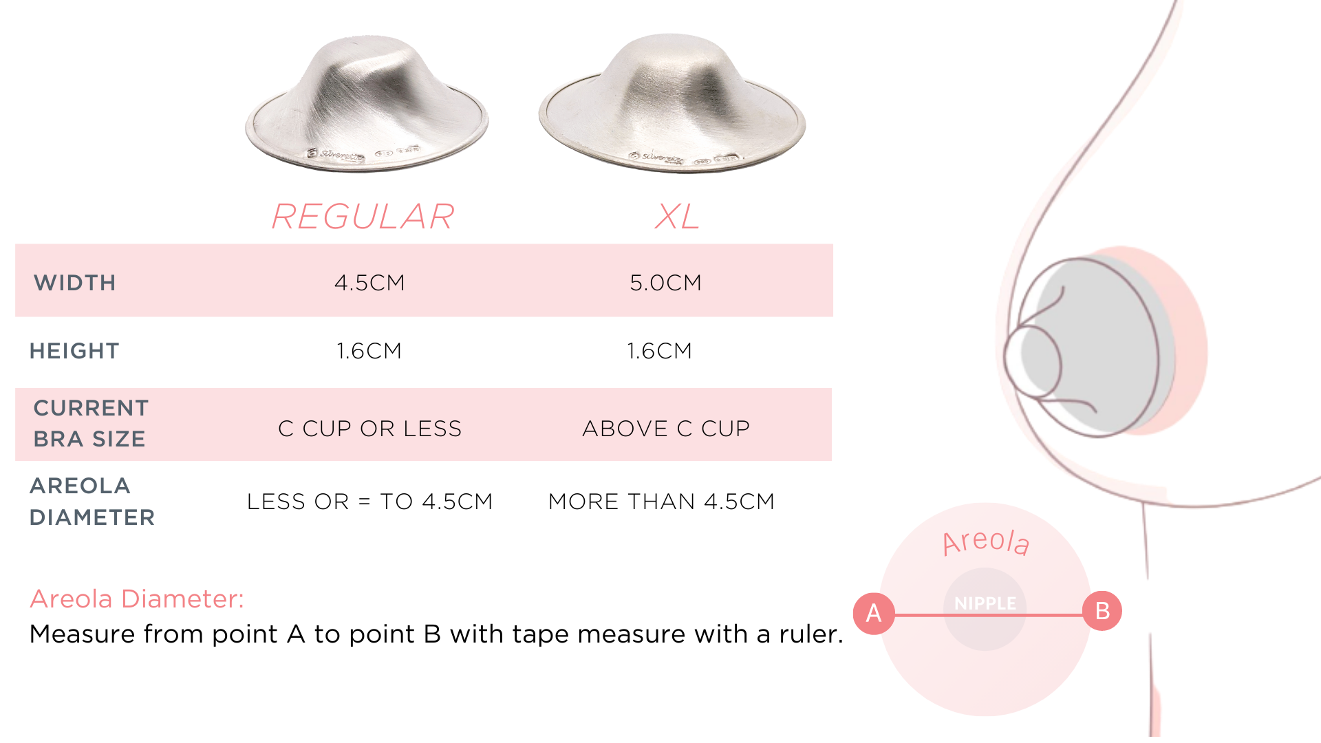 - REGULAR is recommended for breast cup sizes A to C, with an areola diameter of less than or equal to 45mm